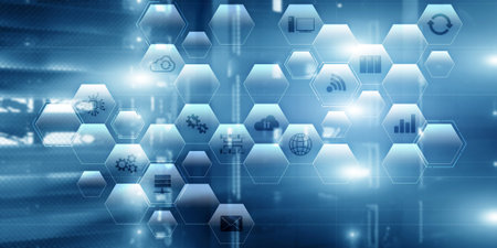 showing futuristic digital interface with glowing blue lines and geometric shapes representing a complex network or data flow on a dark technological...