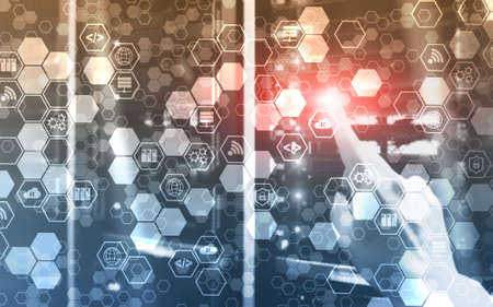 Digital internet connection technology concept. Icons on server rack room background.
