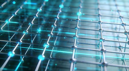 A creative digital illustration depicting Futuristic commercial design background with holographic grid in cyan and silver, glowing nodes, neon underlighting, sci-fi innovative mood. This AI-generated artwork features unique visual elements suitable for various commercial and editorial applications. AI-generated illustration.