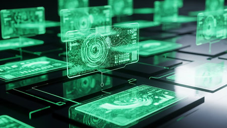 Depth showing futuristic digital interface screens displaying complex data visualizations and circular graphs in glowing neon green against a dark, reflective...