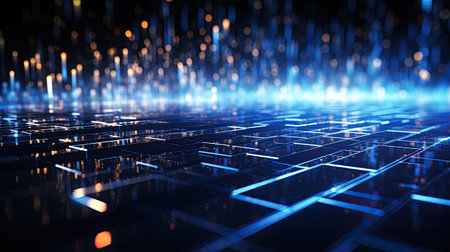 Abstract Technology Background, Futuristic Grid Pattern with Glowing Blue Lights, 3D Render