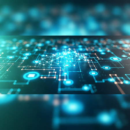 An abstract digital visualization of a glowing blue circuit board with interconnected nodes and lines, representing data flow and network connections.