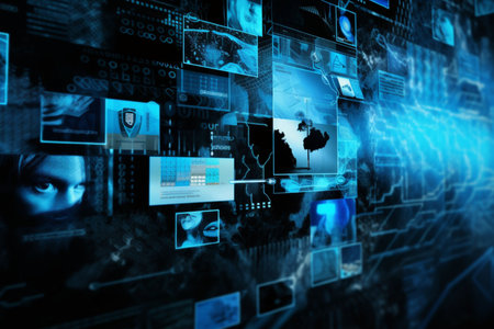 An AI generated illustration of an animated abstract technology interface featuring digital and data interfaces as a background