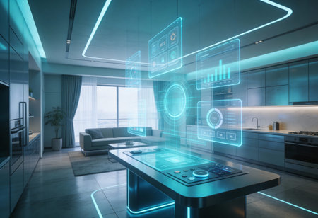 Futuristic interior with streamlined metallic surfaces, touch-screen counters, and ambient lighting, embodying innovation and smart design in a luxurious kitchen, banner