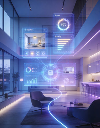 futuristic living room filled with sleek and futuristic furniture, floating screens, and holographic projections, generative ai