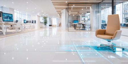 Modern office lobby with illuminated floor grid and lone swivel chair conveying calm