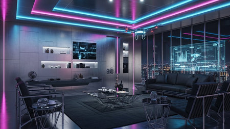 A sleek and modern interior design with neon blue accents and a minimalist aesthetic