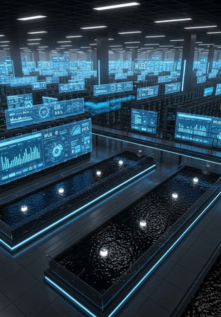 A futuristic server room with rows of computer servers and screens in a blue-lit environment