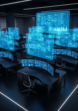 A futuristic control room with multiple screens displaying data and graphs in a dark and modern environment