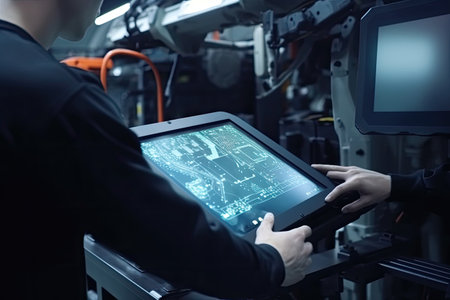 Engineer working on tablet computer in factory. Industrial and technology concept, An engineer rearview and hands close up working with computer tablet, AI Generated