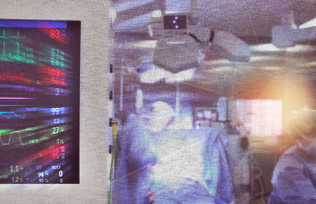 Blurred granular image of medical monitor with defocused background of doctors working in operating room