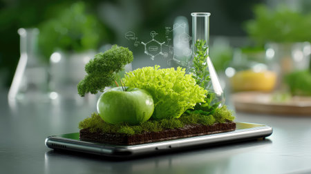 This image illustrates the intersection of technology and nature, featuring a smartphone integrated with lush greenery, a laboratory flask, and a vibrant apple.