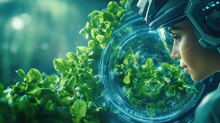 Futuristic agriculture technology: woman in helmet analyzing green crops with digital interface.