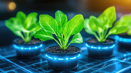 Futuristic hydroponic lettuce in glowing pots showcasing advanced agriculture.
