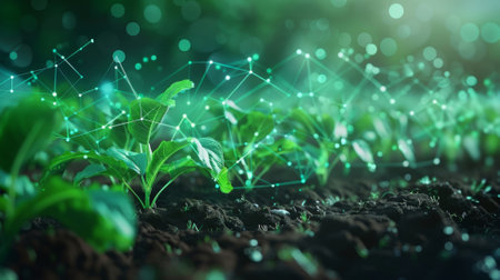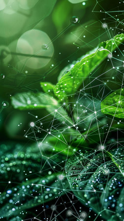 A serene close-up of vibrant green leaves with an abstract connection overlay representing the blend of nature, technology, and growth in modern sustainability practices.