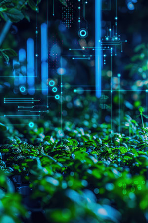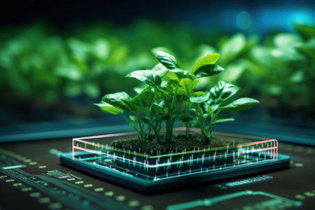 In a futuristic setting, lush green plants thrive on a circuit board, symbolizing the fusion of nature and technology.