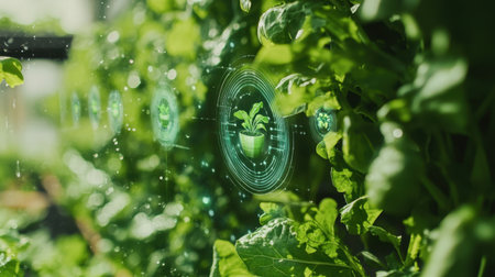 Explore a vibrant hydroponic garden scene featuring digital interfaces that track plant growth and environmental factors, emphasizing innovation in sustainable agricultural practices.