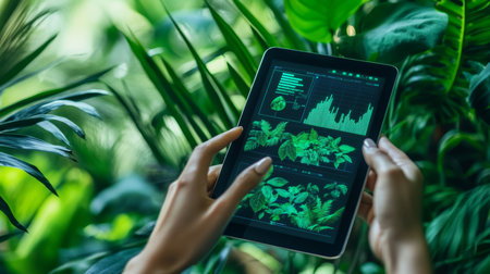 Hands skillfully interacting with digital graphs on a tablet surrounded by vibrant green foliage