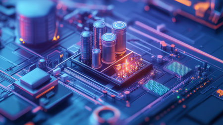 Futuristic technology scene. Intricately designed computer components in a high-tech setting, highlighted by vivid colors.