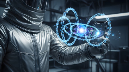 A person in a silver futuristic suit holds a smartphone displaying a glowing blue atomic model...
