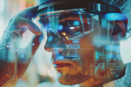 Pioneering microchip innovation: a specialist manipulates a holographic processor in a sterile lab.