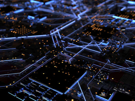 Abstract technology background of a quantum computing system with processor, electronic circuit. Artificial neurons, global data connections