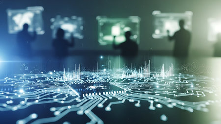 Explore a stunning futuristic digital landscape featuring circular data patterns and glowing connections against a distant cityscape backdrop at night.