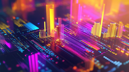 This image features an abstract digital cityscape showcasing glowing circuitry and futuristic towers, illuminated by vibrant neon lights in a dark setting.
