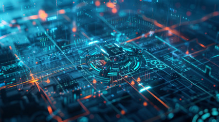 Futuristic technology scene. Intricately designed computer components in a high-tech setting, highlighted by vivid colors.