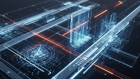This abstract image showcases a futuristic cityscape with intricate circuits and glowing orange lines, symbolizing advanced technology and connectivity in a digital environment.