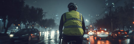 A cyclist wearing a reflective vest navigates busy streets under rain at night, surrounded by illuminated vehicles and city lights.