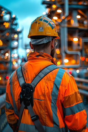Close-up shot of a workers back wearing a high-visibility safety jacket in an industrial setting