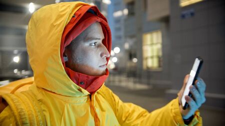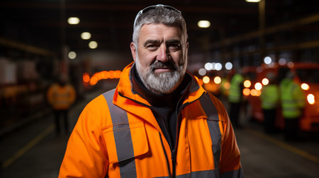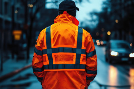 Construction worker wearing orange high visibility jacket standing on city street at night