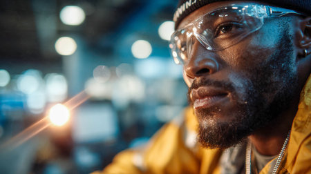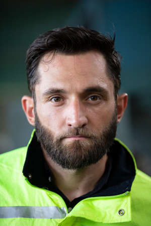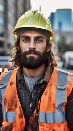 Portrait of a construction worker in yellow helmet, showing dedication, strength, and industrial resilience.