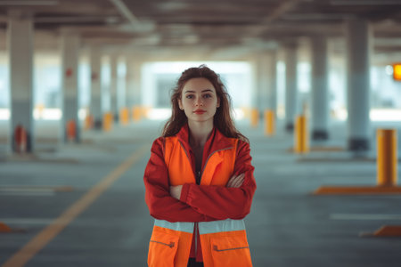 A woman wearing an orange safety jacket and helmet. She is looking up at something. Concept of caution and responsibility