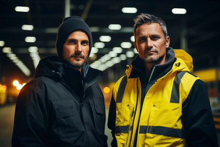 The image features a group of people wearing bright yellow and blue high-visibility jackets. The jackets appear reflective and the focus is on the upper bodies. The composition shows close-up details. The lighting suggests an outdoor or industrial setting. This image could be suitable for various commercial or editorial applications.