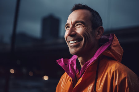 Handsome middle aged man in yellow raincoat looking away while standing against dark background