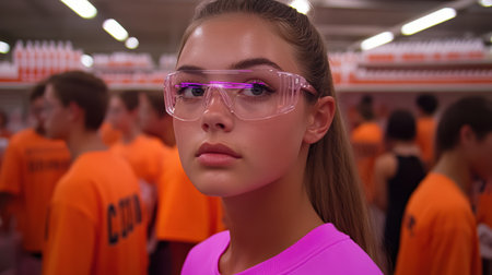 Young student wearing safety goggles and vibrant shirt crowded science fair showcasing projects