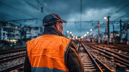 A solitary worker in a bright orange safety vest stands on the railway tracks during a rainy evening, gazing into the distance as city lights blur in the background.