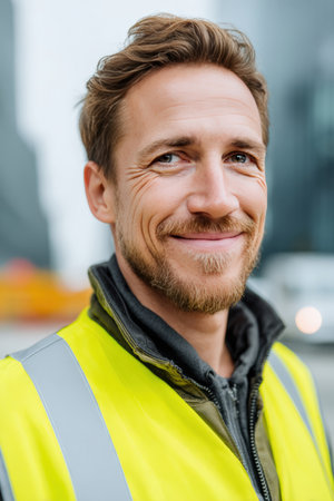 Smiling Engineer in Reflective Vest with Clear Sky Background