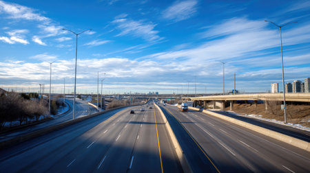 Serene view of an empty highway under a bright blue sky, showcasing the contrast between urban skyline and open space, ideal for travel themes.