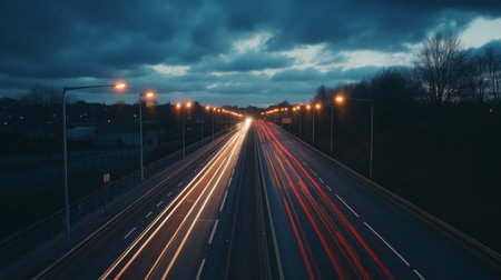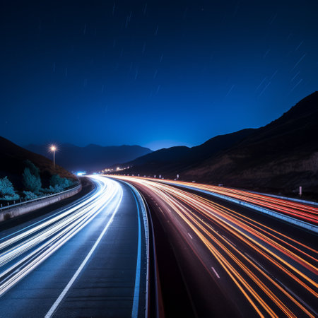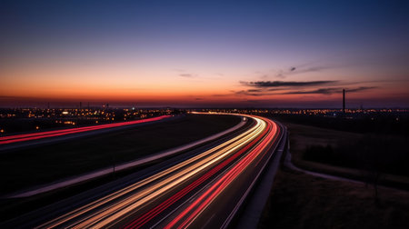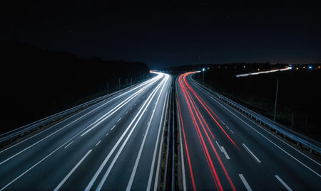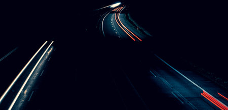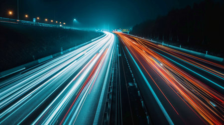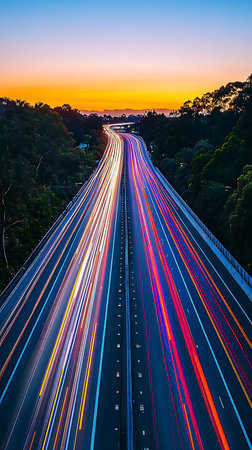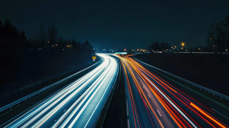 A nighttime shot of a highway with long exposure light trails from cars, capturing the motion and energy of traffic.