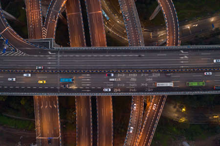 Aerial overhead shot of flyover highway traffic before dawn in Chongqing,Southwest China