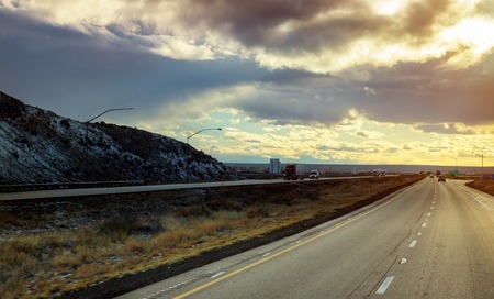 New Mexico view panoramic a highway runs from through the brush and mesas of the high desert.