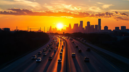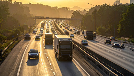 A panoramic view of an expressway during sunset, with vibrant sky colors reflecting off the road and vehicles, highlighting the beauty of evening travel.