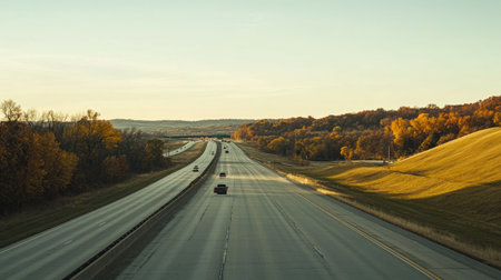 A tranquil highway stretches into the distance, flanked by vibrant autumn trees. The scene captures a peaceful drive under clear skies, showcasing nature