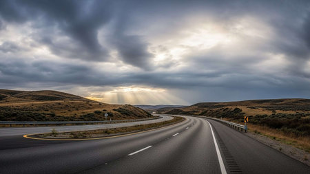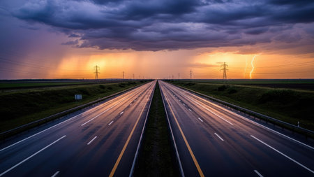 The long stretch of highway seems to disappear into the horizon creating an endless road that beckons to adventurous drivers. . AI generation