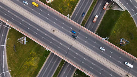 Summer aerial photo of transport junction, traffic cross road junction day view from above with circle road. Top down view of traffic jam