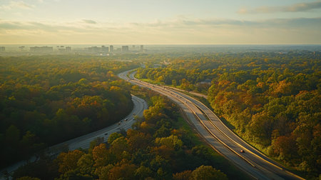 An aerial view capturing a scenic highway winding through vibrant autumn trees with a distant urban skyline, showcasing the beauty of nature and transportation.