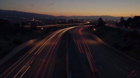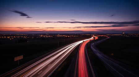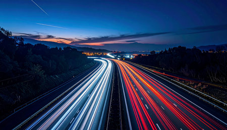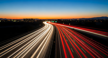 A stunning long-exposure shot captures the vibrant energy of a busy highway at dusk.